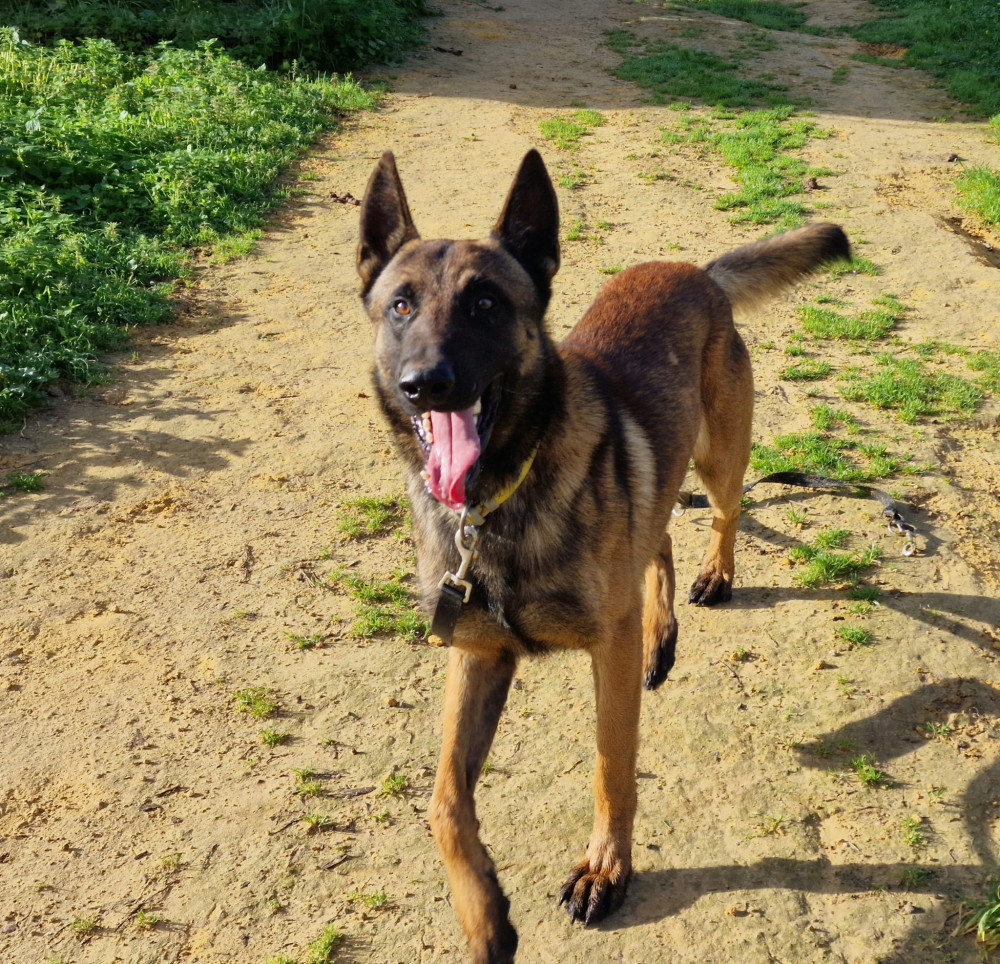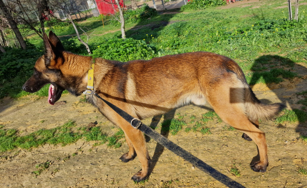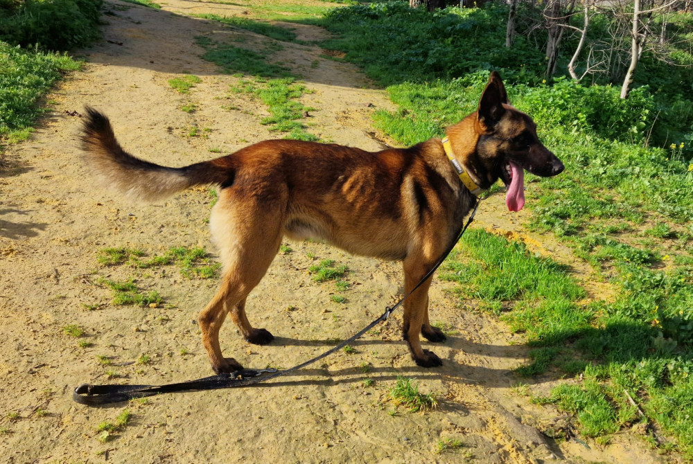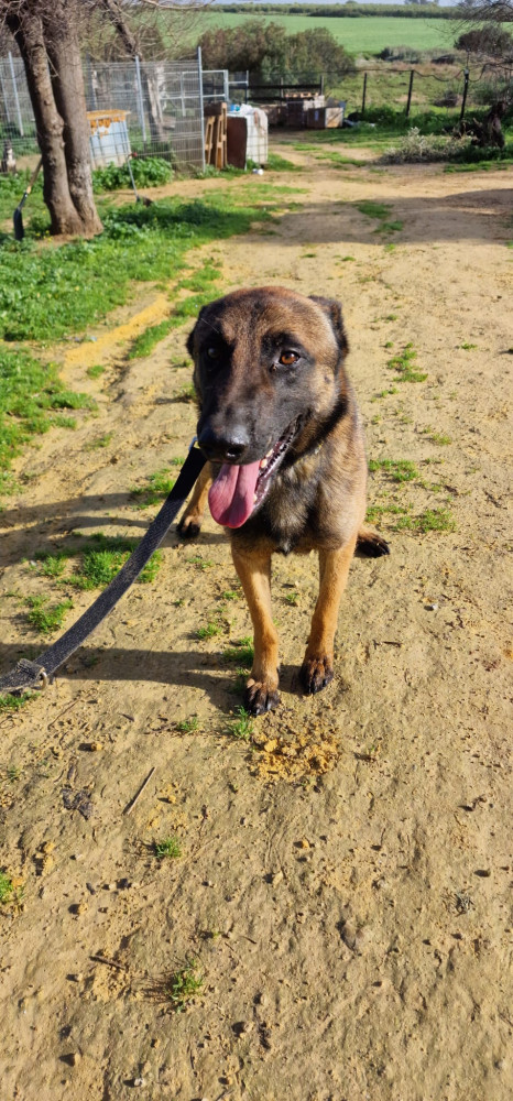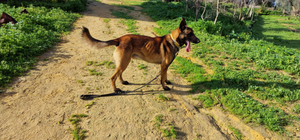 Varias veces nos habíamos encontrado un malinois buscando entre la basura, pegado a la carretera, en inminente riesgo de atropello. Varias veces intentamos cogerle, tanto nosotros como otros compañeros rescatistas de la zona, sin éxito. Esta vez le vi a escasos 50 m de la rotonda que une la carretera con la autopista, en una zona de tránsito de camiones super peligrosa. Paré en el arcén, cogí la comida húmeda y la correa que siempre me acompañan, y le llamé hacia el otro lado del quitamiedos, intentando que se apartara de la carretera. Como sabía que estaba muerto de hambre, la comida era la única oportunidad. Tras una media hora de acerca, aleja, come, se aparta, me ladra, vuelve, le acaricio, se aleja, vuelve, come...al final le pude poner la correa y le subí al coche. Una vez en el coche, apoyó su cabeza contra la mía y fue todo el camino de vuelta al refugio dándome besos. Es un perro noble, muy cariñoso, muy limpio en el interior, y por ahora con los perros con los que le he juntado, se ha comportado estupendamente. Es un perro que va a ser el compañero perfecto para alguien que tenga una vida activa y quiera un compañero para toda la vida.